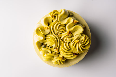 ケーキの中には、敢えて果肉感を残した甘酸っぱいアプリコットのジュレと、すっきりとした酸味の中に優しい甘さを感じるパッションフルーツのクリームを重ね、ピスタチオの濃厚さが調和するバランスの良い味わいに。