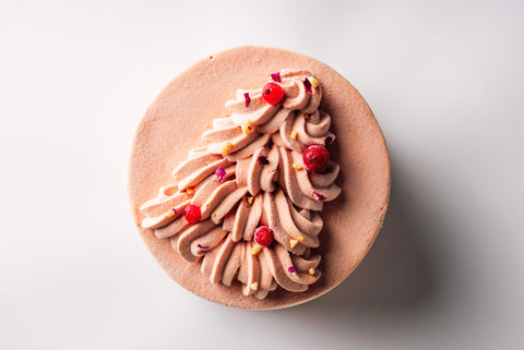 ラズベリーのバタークリームでクリスマスツリーを描き、薄ピンク色でシンプルにまとめた可愛らしいクリスマスケーキにです。