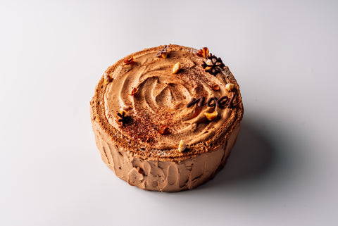 飾りには有機チョコレートホイップとヘーゼルナッツで、落ち葉や木の実が転がる切り株を表現するなど、細部にまでこだわりました。