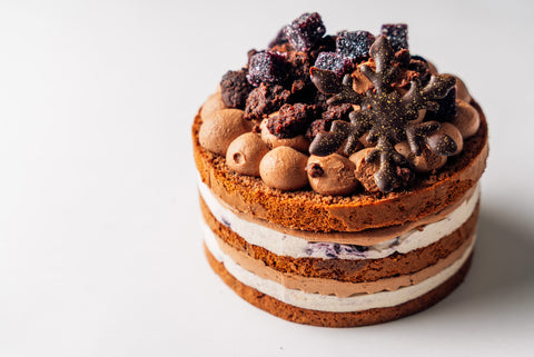 乳化剤・香料不使用の有機チョコレートを使用したガナッシュとムースの層に、キャラメルムースと塩キャラメルソースを重ねたメリハリのあるケーキです。